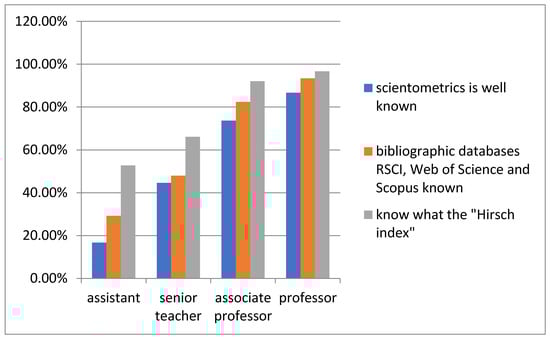 Most respondents have a neutral attitude to scientometrics (56.9%); 26.9% have a positive attitude to this discipline, and 16.2% have a negative attitude. These figures show that, in general, the teaching community has already adapted to the administration’s requirements and is relatively favorable to scientometrics (definitely—about a quarter), and opponents are outnumbered. It is also likely that the desire of some teachers, especially from provincial universities, to indirectly demonstrate their loyalty to the university authorities (whose primary concern is to formally increase the scientometric indicators for reporting to the ministry) has affected this situation.