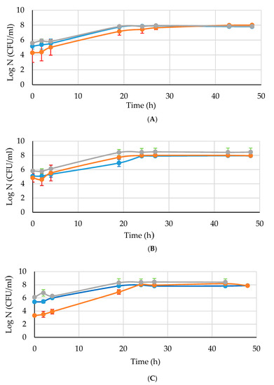 Growth curve of the strains 2, 7, 47 and S122 in synthetic medium. Symbols indicate different samples as blue circle (control), orange circle (temperature-pretreated) and grey circle (ethanol-pretreated). (A) S. cerevisiae 2; (B) S. cerevisiae 7; (C) S. cerevisiae 47; (D) S. cerevisiae S122.