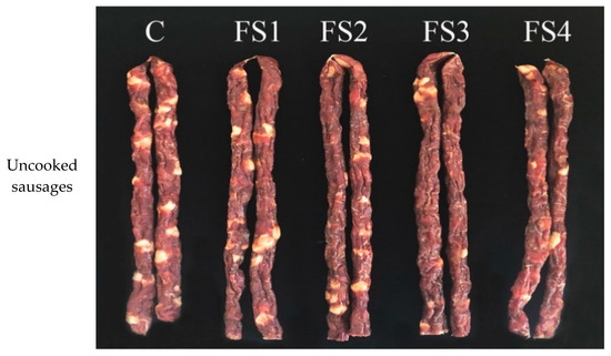 The sensory scores for all the envaulted attributes (colour, texture, juiciness, firmness, flavour and acceptability) and the appearance of the uncooked sausages, cooked sausages and slices of cooked sausages containing true back-fat and CFS are shown in Figure 4 and Figure 5. Atypical appearances were observed in the sausages with high levels of CFS. First of all, the appearance of the sausages with high levels of CFS were more wrinkled and irregular than the others due to the lower moisture content at the end of fermentation. Moreover, the captured image of the uncooked sausages without or with lower levels of CFS presented more white true back-fat than the sausages with high levels of CFS, which highlighted the white appearance of true back-fat compared to CFS. The true back-fat was swollen and shiny after cooking, and the slices of cooked sausage containing true back-fat were relatively compact. It is noted that these atypical appearances (wrinkled appearance and white fat losing) presented in the sausages with high levels of CFS (FS3 and FS4) may lead to a significant reduction in the desire and appetite of consumers. The FS3 and FS4 treatments received the lowest scores for all the attributes (p < 0.05), demonstrating that excessive fat replacement may cause a noticeable deterioration of the sensory quality of the sausages. Moreover, consistent with the moisture content and aw results, the excessive moisture evaporation led to the dryness and firmness of the FS3 and FS4 treatments [32].