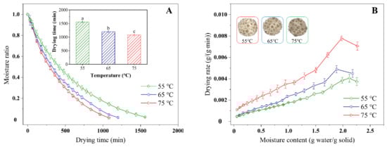 The drying characteristic curves of chrysanthemum cakes underwent different conditions, showing that the moisture content decreased from 74.86% (wet basis) to less than 10% (wet basis) with increasing drying time (Figure 3A,C,E), with drying times varying from 1080–1560, 300–750, and 660–2040 min for HAD, IR-HAD and IR-HAD + HAD, respectively. Successive increases in temperature significantly (p < 0.05) reduced drying time, especially when the temperature was increased from 55 to 75 °C, IR-HAD + HAD led to a 70.54% reduction in drying time, which may be due to the enhanced thermal driving force within the chrysanthemum cake caused by the increased temperature []. Figure 3B,D,F indicated that the drying rate gradually reduced with a decrease in the dry basis moisture content. The constant rate period was absent during the drying process of the chrysanthemum cakes. As shown in Figure 3B, a transient rising phase in the drying rate curve was observed, which was because samples were still in the warming stage. Considering the effect of drying strategies on the drying characteristics of chrysanthemum cakes, IR-HAD with the shortest drying time was found to possess a higher drying efficiency than the other drying strategies. This may be because chrysanthemum flowers are double flowers with multiple whorls, which are not conducive to heat transfer. However, infrared radiation with penetrating ability could rapidly warm up the sample by exciting the vibration and friction of water molecules []. Unfortunately, the sequential drying method (IR-HAD + HAD) was not effective in improving the drying efficiency, except at 75 °C. This phenomenon may be related to the formation of a porous structure due to the rapid moisture removal from the core to the surface in the first stage (IR-HAD) []. However, when the samples were transferred to a relatively mild drying environment (HAD), the collapse of porous structure resulting from continuous shrinkage hindered moisture migration, thus prolonging drying time [].