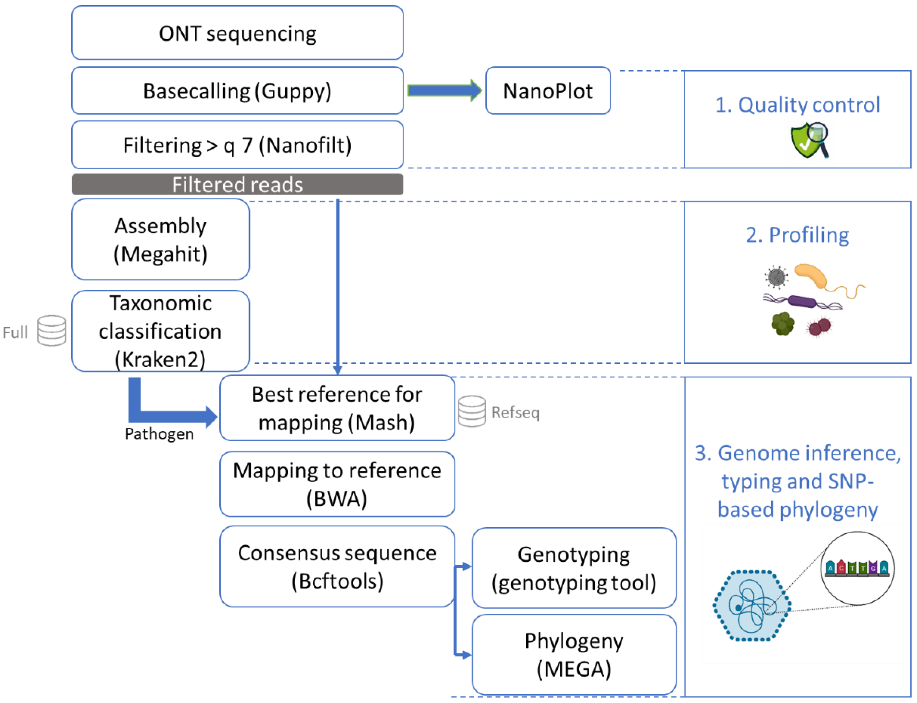 - Buytaers, F.E.; Saltykova, A.; Denayer, S.; Verhaegen, B.; Vanneste, K.; Roosens, N.H.C.; Piérard, D.; Marchal, K.; De Keersmaecker, S.C.J. Towards Real-Time and Affordable Strain-Level Metagenomics-Based Foodborne Outbreak Investigations Using Oxford Nanopore Sequencing Technologies. Front. Microbiol. 2021, 12, 738284. [Google Scholar] [CrossRef] [PubMed]