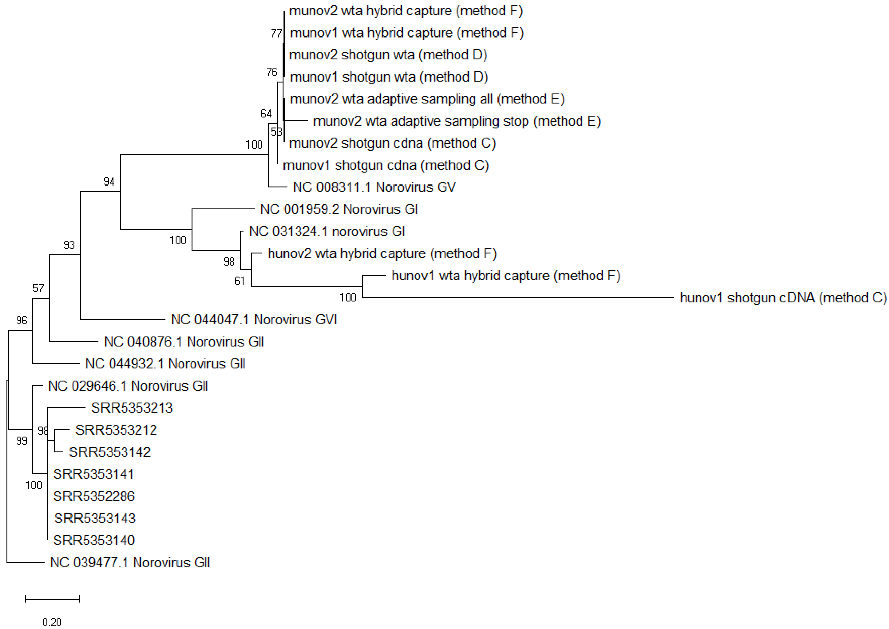 | SRR5353159 | NOV GII.4 103 + NOV GII.6 104 -2 | 2,203,937 | 13,245 | 200 | 7076 | 665 | 94 | 7 | 0 | NC_029646.1 (NOV) | 72 | 1/1000 | n/a | n/a | n/a | n/a |
