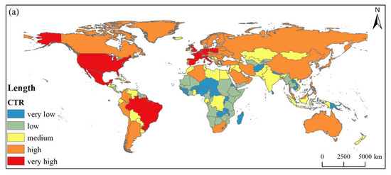 From a country-level perspective, 11, 45, 51, 51, and 40 countries have CTR indices from very high level, to high, to middle, to low, to very low level, respectively. The few countries with a very high CTR level include the Netherlands, the USA, Germany, Belgium, France, Spain, Britain, Italy, Mexico, Poland, and Brazil. There is little difference in the indices across the other CTR levels. In terms of spatial distribution, European and American countries generally have very high and high CTR levels (Figure 7a). The CTR index of countries in Africa is low, with the exception of Algeria and South Africa. In Central Asia, South Asia, and Southeast Asia, the CTR level is medium or lower. Some countries in Western Asia, China, the Philippines, Malaysia, and Australia are at a high CTR level (See Figure 7a and Table 5).