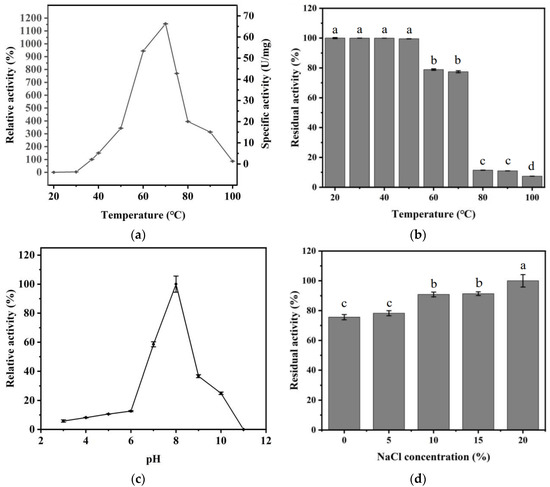 ECH was added to various concentrations of sodium chloride (0, 5, 10, 15, 20%, w/v) solutions and ethanol (0, 10, 20, 30, 40, 50, 60%, v/v). Later, the solution was stored at 20 °C for 1 h, and the ECH activity was measured at the optimum temperature.