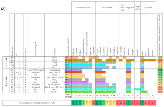Biochemical profiles were generated based on the 49-carbohydrate utilization ability of Leuconostoc (Leuc.) carnosum (n = 51) (A) and Latilactobacillus (Lb.) sakei (n = 48) (B) isolates. All carbohydrate substrates (API 50 CHL) were categorized into monosaccharides, disaccharides, trisaccharides, sugar acids, sugar alcohols, and glycosides. The isolate’s ability to utilize a carbohydrate is represented as a positive (coloration) or negative (white color) reaction. The carbohydrates that were not utilized by a single isolate are not represented in the figure. The isolates were categorized according to sample type into raw meat (RM), food processing environment (FPE), and end product. The Leuc. carnosum and Lb. sakei PFGE types were color-coded representing different biochemical fermentation profiles and carbohydrate utilization patterns. The numbers on the right represent the percentage of carbohydrates utilized per isolate, while the numbers on the bottom represent the percentage of a single carbohydrate per studied group of isolates. Gradient scale: 0% (red)—100% (green). Abbreviations: B: brine; BC: brine cultures; CB: cutting board; CH: cooked ham G: gloves during packaging of the end product; HAT: ham after tumbling; CC: cellulose casing; RM: raw meat; RMDB: raw meat delivery box; T: trolley; TAS: tumbler after sanitation.