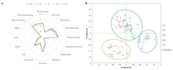 In Figure 1a and Figure 2a, we can observe the average scores obtained in the sensory analyses of the dry-cured loin and “cachaço”. For these products, the panel tasters evaluated 16 quantitative sensory attributes (muscle color, flavor persistency, flavor intensity, bitterness, acidity, sweetness, saltiness, chewiness, juiciness, hardness, skatole odor, androsterone odor, odor intensity, fat distribution, muscle/fat, and fat color). The obtained results indicated that all dry-cured loin and “cachaço” were characterized by relatively high overall quality. For both dry-cured products, the different treatments applied to the animals’ feed had no significant effects on tasters’ evaluations of the attributes described above. Concerning dry-cured “cachaço”, flavor intensity (5.96–6.36), flavor persistency (5.78–6.05), muscle color (5.50–6.00), odor intensity (5.94–6.30), and juiciness (5.80–6.19) were the attributes with the highest scores by the panel of tasters for all the different treatments. As for the dry-cured loin, the most outstanding attributes were flavor intensity (5.78–6.05), flavor persistency (5.36–5.81), muscle/fat ratio (6.69–7.03), heterogeneous fat distribution (6.21–6.56), and odor intensity (5.76–6.01). On the other hand, the panel of tasters gave the lowest values for both dry-cured products of Bísaro pork for the attributes of acidity, bitterness, and rosterone and skatole odors. For the flavor intensity attribute, an average score of 5.93–6.36 for the dry-cured “cachaço” and 5.78–6.05 for the dry-cured loin was given. Lower values were also obtained by other authors for this attribute in dry-cured loin from different lines of Iberian pig (5.22–5.67) []. Regarding odor intensity, slightly lower values were obtained for the dry-cured loin of Entrepelado and Retinto lines for odor intensity []. The values obtained for the juiciness of the dry-cured loin in this study are in line with those obtained for the dry-cured loin of different lines of Iberian pigs with a commercial base diet []. The attributes of muscle/fat, hardness, and juiciness are directly related to animal diet. It is important to mention that the scores for flavor intensity for both products in this study were superior to those obtained by other authors for the dry-cured loin of Iberian pork []. The dry-cured “cachaço” had lower hardness scores and higher muscle/fat and juiciness scores compared to the dry-cured loin. According to Leite et al. [], dry-cured “cachaço” has a higher total amount of fat, which is directly related to sensory assessments by panel tasters. This fact was also verified by the composition of the volatiles. The major aldehydes were significantly higher in the dry-cured “cachaço”, and these compounds were directly related to the amount of total fat. The sensory characteristics indicated that the use of different treatments in the animals’ feed resulted in higher acceptability of the final product. These results are in accordance with those reported by Fortin et al. [] in which juiciness, tenderness, flavor, and absence of off-flavors were the most important attributes comprising the sensory experience during meat consumption.