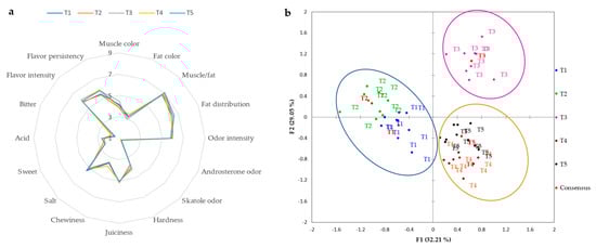 In the present research, in order to minimize the differences between testers, the GPA was used to find a consensus. Figure 1b and Figure 2b show the biplot of the consensus configuration, with the correlations between the sensory attributes, treatments, and coordinates of the dry-cured “cachaço” and loin. For the dry-cured “cachaço” (Figure 1b), F1 and F2 together explained 62.49% of the total variability. Regarding the dry-cured loin (Figure 2b), F1 and F2 together explained 61.26% of the total variability. According to the coordinates of the different types of treatments and the correlation of the sensory attributes, panel tasters separated the treatments into three groups for both products, although they did not have the same trends. Concerning the dry-cured “cachaço”, the taster panel clearly separated treatments T1 (Basal diet and commercial feed) and T4 (Basal diet + 10% exhausted olive cake). Treatments T2 (Basal diet + 10% crude olive cake), T3 (Basal diet + 10% olive cake in two phases), and T5 (Basal diet + 10% exhausted olive cake + 1% olive oil) were grouped into one group. As far as the dry-cured “cachaço” is concerned, the tasters were able, through the 16 attributes studied, to group the T4 and T1 treatments separately. The other treatments were grouped together according to various sensory attributes. For the dry-cured loin, and across the 16 sensory attributes, treatments T4 and T5 were grouped together. This makes perfect sense since these treatments concerned the same type of olive cake except for the 1% fat added in T5. There was another group joining T2 and T1. Finally, T3 was separated from the other treatments.