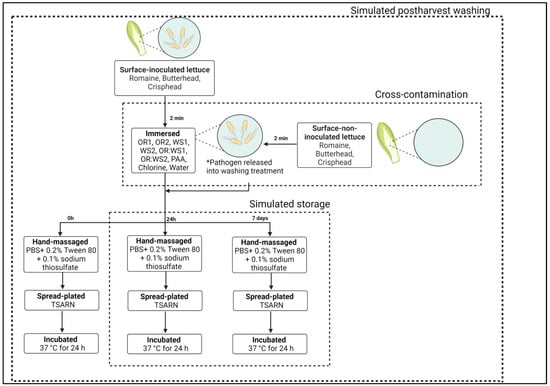 The simulated postharvest washing (Figure 1) was performed according to Cimowsky et al. []. Briefly, surface-inoculated lettuce samples receiving the washing treatment were immersed in a sterile glass dish containing 200 mL of wash solution for 2 min without agitation. Samples were removed from the wash solution using sterile tweezers, placed into sterile Whirl-Pak® bags, and diluted 1:5 (w/v) with PBS containing 0.2% Tween 80 and 0.1% sodium thiosulfate (Fisher Scientific, Fair Lawn, NJ, USA). The lettuce leaves were hand-massaged for 20 s, and the rinsate was serially diluted in buffered peptone water (BPW; Oxoid, CM 509; Fisher Scientific, Fair Lawn, NJ, USA) and spread-plated onto TSARN plates using a sterile L-spreader. The plates were incubated at 37 °C for 24 h, and the colonies were counted. Each wash treatment was performed in triplicate. The results were expressed as log CFU/g.