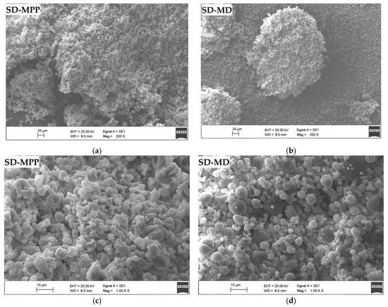 SEM micrographs of SD-MPP and SD-MD microcapsules taken at magnifications of 200×, 1000×, and 5000× are shown in Figure 6, revealing that the morphology of betaxanthin microparticles varies depending on the morphology characteristics of the wall material used [58], that is to say, pitahaya peel mucilage (MPP) [19] and maltodextrin DE-20 [43].