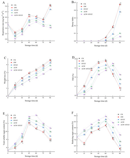 From Figure 2A, there was a sudden drop in the respiration rate during the first 15 days due to a decrease in temperature. After that, the respiration rates of the CK and DW groups continuously increased and peaked on day 45, then decreased from day 45 to day 75, before finally rising sharply during the last 15 days. The last rising might be attributed to the serious infection of pathogens at the later stages of storage, as confirmed by Figure 2B. The HVEF group had a similar trend but peaked on day 60. However, the respiration rates of the AEW and AEW + HVEF groups increased after day 15, peaked on day 60 and then decreased. During storage, the AEW + HVEF group maintained the lowest respiration rate, followed by the AEW group, whereas the CK and DW groups showed no significant difference in respiration rates and retained the highest levels, followed by the HVEF group. Based on the overall trend, the HVEF, AEW and AEW + HVEF treatments not only effectively reduced respiration rates and peak values, but also delayed the appearance of the respiration peak by 15 days. It has been noted that the auxiliary group of oxidase related to respiratory metabolism of fruit contains iron, while HVEF can change the conformation of Fe3+-centered enzymes and prevent their activities, thereby blocking the electron transfer in the respiratory chain and inhibiting respiration [11]. Additionally, the proliferation and development of pathogens can exert a certain impact on the respiration rate of postharvest fruits [35], while AEW exhibits significant antimicrobial efficiency by altering the cell membrane structure of pathogens [25]; therefore, AEW treatment can inhibit the respiration rate.