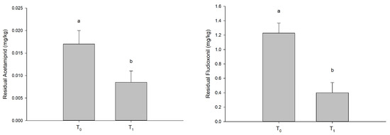The residual pesticide (mg/kg) values in grapes at harvest time (T0) and in untreated grapes after 30 days of cold storage (T1). The bars labeled by different letters are significantly different according to Tukey’s test (p < 0.05).