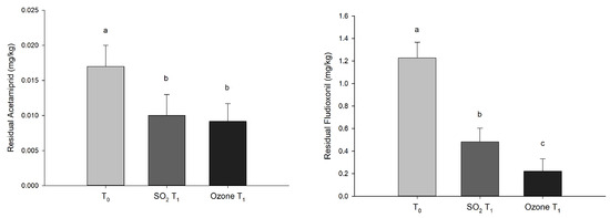 The ozonated water treatments showed, in general, better results compared to the SO2 treatment (Figure 6). Fludioxonil, which has a contact effect, showed the highest average rate of degradation, which was reduced, on average, by 81.9% in the treatments with ozonated water and by 60.7% in the SO2 control treatments. Spirotetramat and fluxapyroxad showed the best results in terms of residues degradation due to the ozone treatment compared to SO2: the two systemic molecules were reduced by 100% (trace level < 0.005 mg/kg) and 67%, respectively, compared to the SO2 treatment, where reductions of only 16.7% and 32% were observed. Differently, acetamiprid and flupyradifurone showed a low degradation rate, being reduced, on average, by 46.1% and 40.8%, respectively, in the treatments with ozonated water and by 41.2% and 20.7%, respectively, in the SO2 control treatments. It should be highlighted that, because of the effects of all of the treatments, only traces (<0.005 mg/kg) of penconazole and proquinazid were detected at T1, while trifloxystrobin residues were totally degraded in all of the samples.