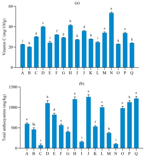 The content of total anthocyanins in red grape berries was determined using the pH differential method with dimethyl anthocyanin (mg/kg) [13]. The flavonoid content was determined using the sodium nitrite-aluminum nitrate method [19]. The total phenol content was determined using the Folin-Ciocalte method [20]. The content of vitamin C in fruits was determined using the 2,6-dichloroindophenol method [21]. The tannin content was determined using the Folin–Denis method [22].