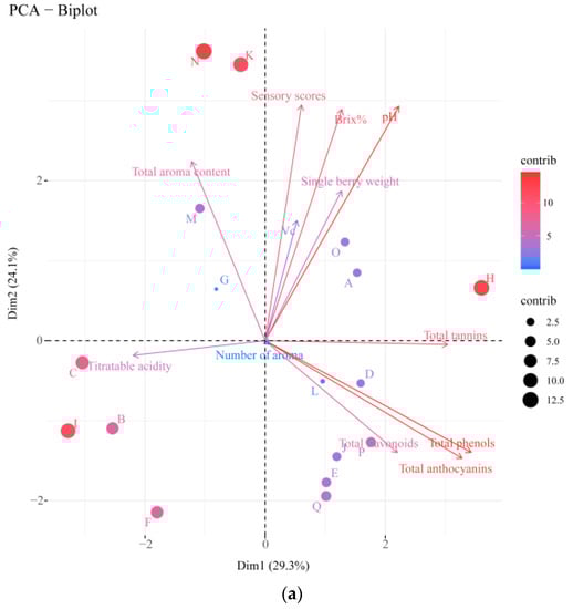 In the comprehensive evaluation of the quality of table grapes, the appearance, flavor, texture, and other factors of the fruit should be considered, as well as the nutritional value of the fruit, such as soluble solids and titratable acids, to ensure the comprehensive evaluation of information. The PCA is a multivariable data analysis technique for dimensionality reduction and showing relationships/correlations between variables and samples [36,37]. In this study, 11 main indices that can reflect fruit quality were selected for a comprehensive evaluation of grapes using PCA, and the results were objective. The first two principal components explained 53.4% of the original variables, and varieties C, B, and I were more affected by acids. Varieties M and G had higher contents of aroma components, which could be classified into one group, variety A had higher contents of vitamin C, variety H had higher contents of tannin and C6 compounds, and variety I had higher contents of vitamin C than other varieties, which were close to the principal component axis (Figure 3a).