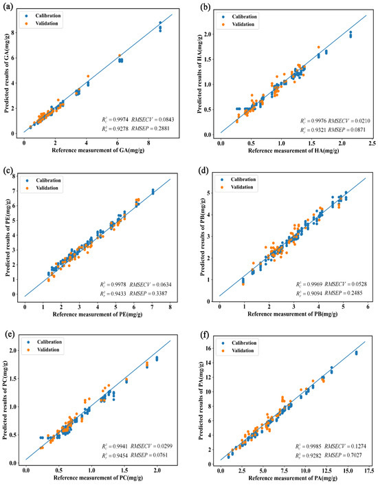 Graphical relationships between reference values and predicted values of the optimal calibration models for (a) gastrodin (GA); (b) p-hydroxybenzyl alcohol (HA); (c) parishin E (PE); (d) parishin B (PB); (e) parishin C (PC); (f) parishin A (PA); (g) the sum of gastrodin and p-hydroxybenzyl alcohol (GA + HA); and (h) the sum of gastrodin, p-hydroxybenzyl alcohol, parishin E, parishin B, parishin C, and parishin A (total).