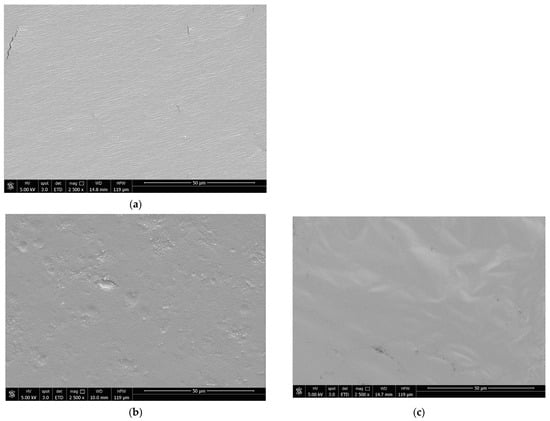 The surface morphology of the films was examined using scanning electron microscopy (Quanta FEG 650, FEI, Hillsboro, OR, USA) with an accelerating voltage of 5 kV. Before analysis, all samples were mounted on aluminium stubs using carbon adhesive tape and sputter-coated with gold (thickness of about 10 nm) in a vacuum coater (Leica EM ACE200, Wetzlar, Germany).