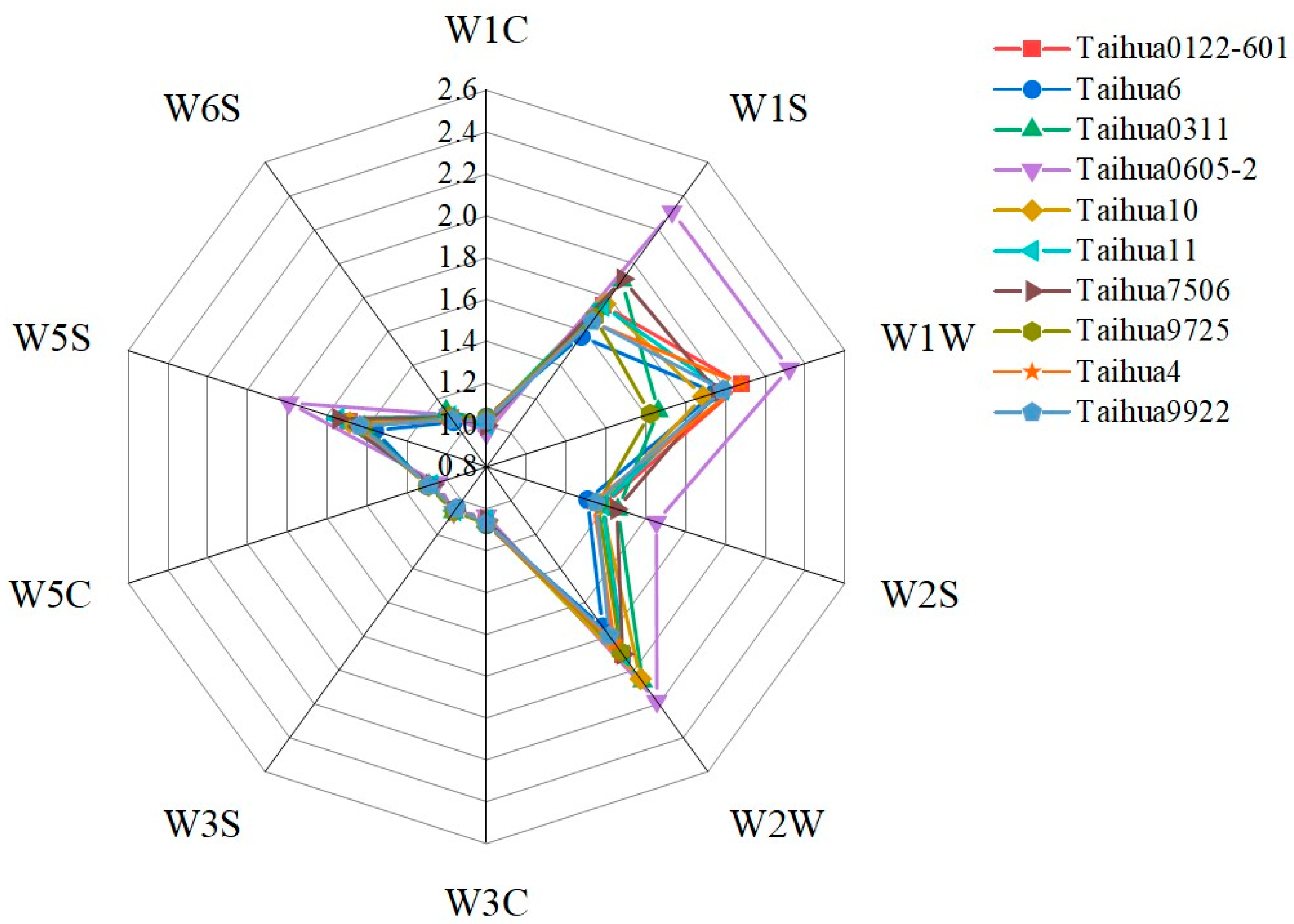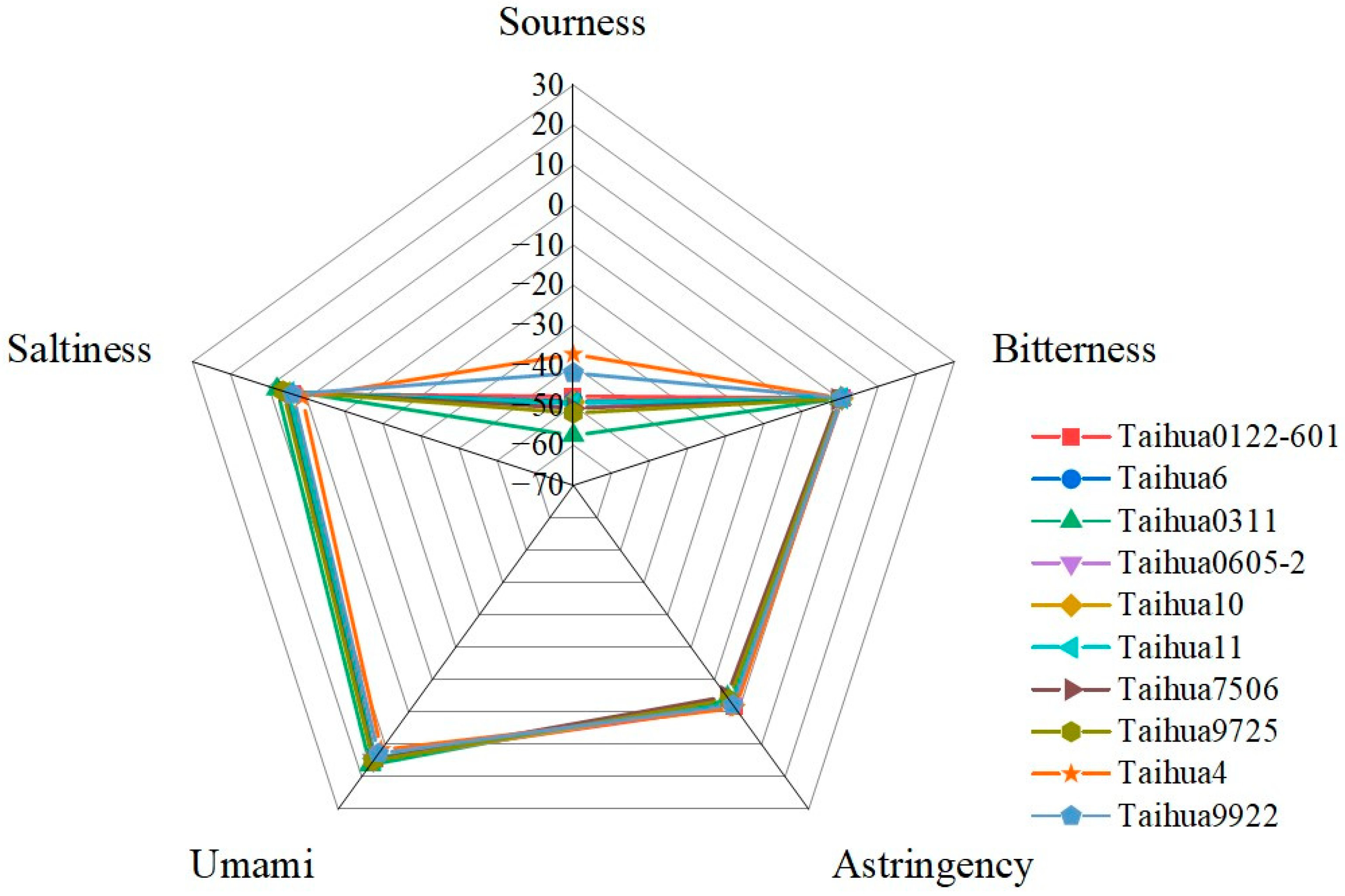 | 5′-Nucleotides/mg/g | Taihua0122-601 | Taihua6 | Taihua0311 | Taihua0605-2 | Taihua10 | Taihua11 | Taihua7506 | Taihua9725 | Taihua4 | Taihua9922 |