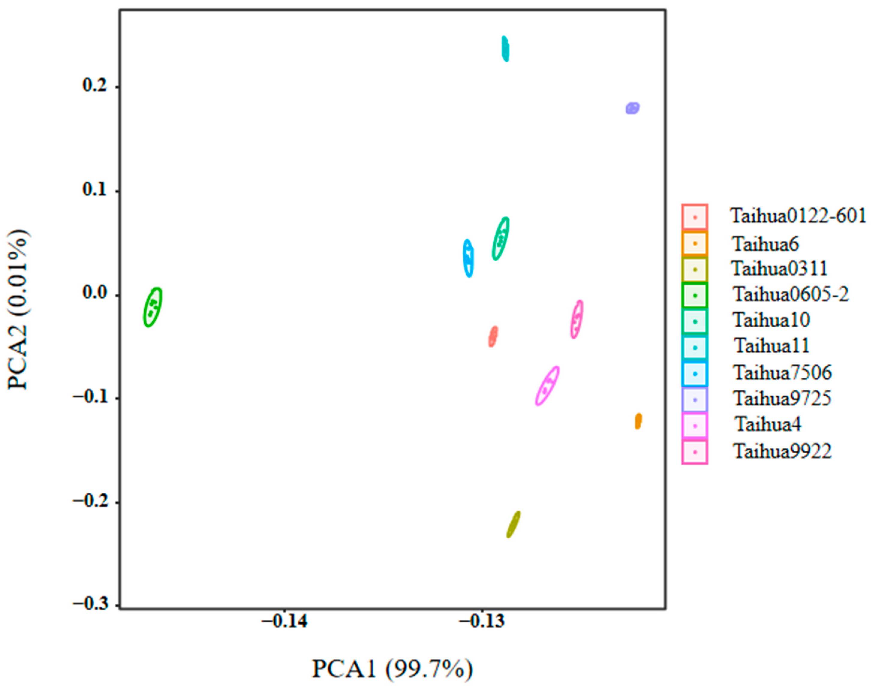 | Relative Amount/% | Taihua0122-601 | Taihua6 | Taihua0311 | Taihua0605-2 | Taihua10 | Taihua11 | Taihua7506 | Taihua9725 | Taihua4 | Taihua9922 |