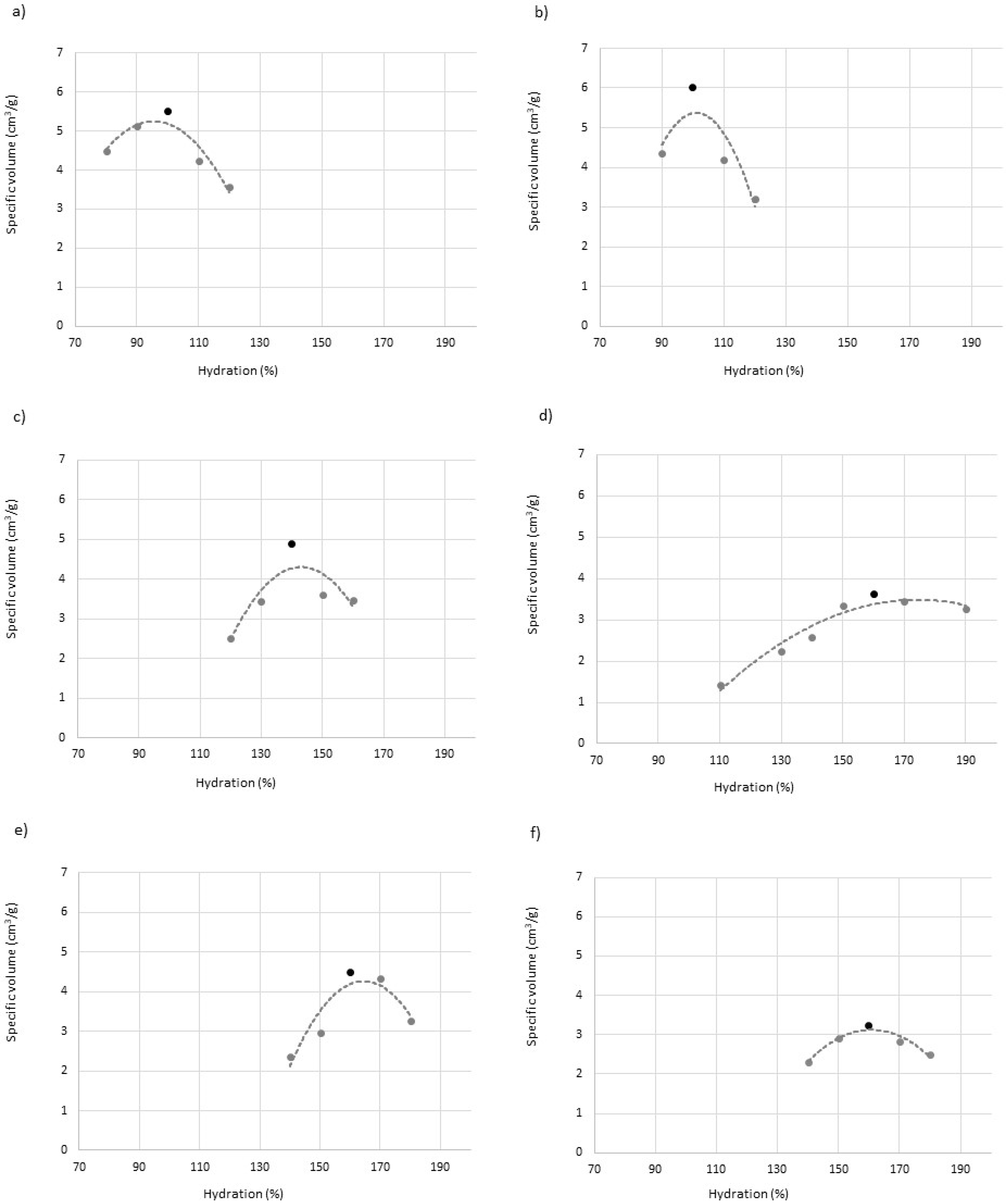 | Optimal Hydration (%) | Specific Volume (cm3/g) | Weight Loss (%) | |