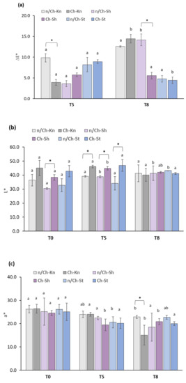 Color properties—(a) ∆E*, (b) L*, (c) a* and (d) b*—of vacuum-packed non-coated and coated beef cut samples over the storage period of 0 (T0), 5 (T5) and 8 (T8) days at 4 °C. n/Ch–Sh = non-coated shoulder; Ch–Sh = coated shoulder; n/Ch–St = non-coated striploin; Ch–St = coated striploin; n/Ch–Kn = non-coated knuckle; Ch–Kn = coated knuckle. Columns represent the mean (n = 3), and the bars represent the SD. a,b Different letters indicate significant differences (p < 0.05) for the same beef cut sample and with the same treatment over the storage period (T0, T5 and T8). * Significant differences (p < 0.05) between the same beef cut with different treatments (non-coated and coated samples) on the same storage day.