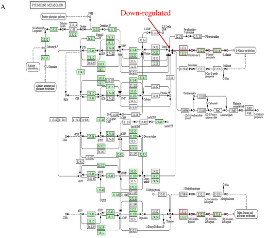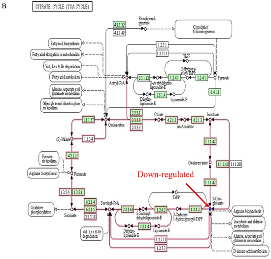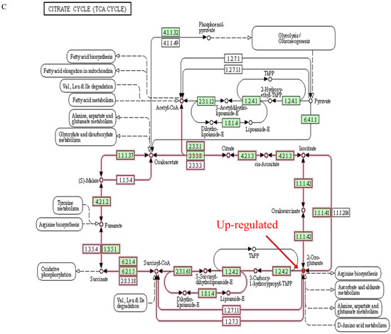 KEGG signal pathway analysis after treatment with LYCRPLs: (A,B) changes in rat fecal metabolites induced by high-fat diet in pyrimidine metabolism (A) and the TCA cycle (B); (B,C) changes in high-fat-diet rat fecal metabolites in the TCA cycle before (B) and after (C) treatment with LYCRPLs; (D,E) changes in high-fat-diet rat intestine D-glucose in terms of glycolysis (D) and bile secretion (E) after treatment with LYCRPLs. (A–E) The small circle represents metabolites, the red indicators represent up-regulation, and the blue ones represent down-regulation. The large squares represent other metabolic pathways, the small ones represent enzymes, and the small green ones represent enzymes unique to this species. The solid arrow indicates the reaction direction, and the dashed one indicates the relationship with other metabolic pathways.