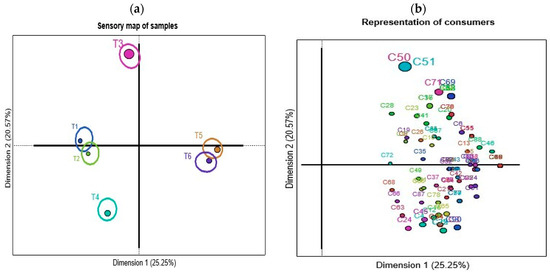 In Figure 2a, the map of panettone samples is observed, where this discriminative test generates four groups, where T1 and T2 form a group, T5 and T6 another group and samples T3 and T4 form independent groups; these last samples show a clear separation from the rest of the samples. Regarding the representation of consumers, an expected heterogeneity is revealed in the grouping of the samples, which can be explained by the interindividual variability between consumers. Figure 2c shows the list of terms or words most frequently generated by consumers when describing the samples, which are pleasant, sweet, dry, lots of smell, lots of flavor, spongy, good texture and soft, which recorded frequencies greater than 30% mention. Figure 2d presents the sensory map through CA explaining 45.82% of the total variability in the first two dimensions. The location of the samples is explained mainly by the type of products; the traditional samples are grouped by their ingredients and the commercial ones by certain characteristics reported by consumers. When observing the classification, samples T1 and T2 were described by a percentage of consumers as yellow in color; a similar behavior is observed for T4 characterized as yellow in color by another group of consumers, although this is different in other attributes from the rest of the samples. Sample T5 and T6 are characterized by having a lot of smell, flavor and fruits. Sample T3 is different from the other samples described with little yellow and low flavor, because it has a simpler formulation compared to the other samples. It uses basic ingredients such as wheat flour, sugar, vegetable fat, yeast, candied fruits, eggs and certified essences. Through the consensus of words, the most used attributes were yellow color, fruit, strong aroma and flavor. Sensorially, it is not expected that samples T5 and T6 were described in a similar way, since T6 has a sweetener that replaces sugar; however, consumers did not perceive this change, which indicates that it is viable to replace the sugar content in panettone. This method allowed us to record how consumers perceive the sensory attributes of panettone, reaching a consensus, grouping the samples according to their similarities. These dissimilarities or similarities can be generated by the quality of ingredients such as flour, yeast, dried fruit and spices, which can significantly affect the flavor and texture of the panettone [57,58].