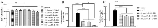 In order to determine whether T-4-O of different concentrations had toxic effects on mouse RAW264.7 macrophages, seven concentrations were used, 12.5 μmol/L, 25 μmol/L, 50 μmol/L, 100 μmol/L, 200 μmol/L, 400 μmol/L, and 800 μmol/L, with a blank control group without T-4-O. After 24 h of treatment, a CCK-8 assay showed that relative to that of the blank control group, cell viability was 106.60%, 109.24%, 107.85%, 113.19%, 107.86%, 104.89%, and 95.94%, respectively (Figure 1A), and there were no significant differences in cell viability in the groups treated with various concentrations of T-4-O (p > 0.05). These results showed that a concentration of less than 800 μmol/L T-4-O did not affect the viability of RAW264.7 cells. Next, we analyzed the effects of 50 μmol/L, 100 μmol/L, and 200 μmol/L T-4-O on the LPS-induced inflammatory cytokines IL-6 (Figure 1B) and TNF-α (Figure 1C). The mRNA expression of IL-6 and TNF-α in the LPS model group increased significantly, compared with the blank control group (p < 0.001). The T-4-O treatment and LPS model groups showed that IL-6 and TNF-α mRNA expression decreased in a dose-dependent manner. These results demonstrated that T-4-O can improve inflammatory responses in cells by inhibiting the expression of LPS-induced inflammatory cytokines IL-6 and TNF-α.
