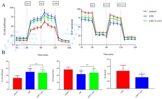 Energy metabolism is intimately associated with macrophage-mediated inflammatory responses. In order to evaluate energy metabolism changes after macrophages were stimulated by LPS, we measured the ECAR and OCR. The results showed that the ECAR increased and OCR decreased after mouse RAW264.7 cells were stimulated by LPS (Figure 2A,B). T-4-O could improve the inflammatory response induced by LPS. Compared with LPS treatment, treatment with T-4-O decreased the ECAR by 5.53%, increased the OCR by 8.66%, and decreased the ECAR/OCR ratio significantly (Figure 2B). These results showed that glucose metabolism in RAW264.7 cells changed from glycolysis to oxidative phosphorylation.