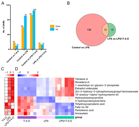 The OPLS-DA model was used to identify DAMs with variable importance in projection (VIP) ≥ 1, p < 0.05, and fold change (FC) > 1.2 or FC < 0.83. As shown in Figure 4A, 151 DAMs were obtained by comparing the control and LPS groups, of which, 91 DAMs were up-regulated and 60 DAMs were down-regulated. These DAMs included spermine, L-proline, L-glutathione (reduced), pantothenic acid, and taurine. There were 13 DAMs that were up-regulated and 14 DAMs that were down-regulated between the LPS and LPS + T-4-O groups, including L-glutamine, L-threonine, pyridoxine, Dl-homoserine, and condore. Venn diagrams were used to compare the common DAMs between the two groups of samples. A total of 12 DAMs were identified across the two comparisons (control vs. LPS groups, and LPS vs. LPS + T-4-O groups) (Figure 4B), which included pantothenic acid, hydroxyhexanoycarnitine, and 1-arachidoyl-sn-glycero-3-phosphate. Among them, four DAMs were down-regulated after T-4-O treatment (Fafar hs-50, trihydroxycoprostanic acid, pantothenic acid, and aniracetam), while eight DAMs were up-regulated (Tetraene ol, Nonadeca ol, 1-arachidoyl-sn-glycero-3-phosphate, 18-acetoxy-1-alpha-hydroxyvitamin d3, estradiol undecylate, (2r)-2-hydroxy-3-(phosphonooxy) propyl henicosanoate, hydroxyhexanoycarnitine, and 3-hydroxyoctanoylcarnitine). We postulate that these 12 metabolites may be associated with the T-4-O improvement in mouse inflammation. Overall, compared to the control group, the number of DAMs significantly increased after the addition of LPS, leading to tremendous changes in metabolites and metabolic pathways in the mouse cells. We also prepared differential expression heat maps and VIP result graphs for the 12 DAMs (Figure 4C,D).