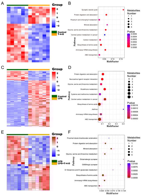 Expression heatmaps and KEGG functional enrichment analysis results of DAMs between different treatments. (A) Expression heatmaps of DMAs between control and T-4-O. (B) KEGG functional enrichment analysis of DAMs between control and T-4-O. (C) Expression heatmaps of DMAs between control and LPS. (D) KEGG functional enrichment analysis of DAMs between control and LPS. (E) Expression heatmaps of DMAs between LPS and LPS + T-4-O. (F) KEGG functional enrichment analysis of DAMs between LPS and LPS + T-4-O.