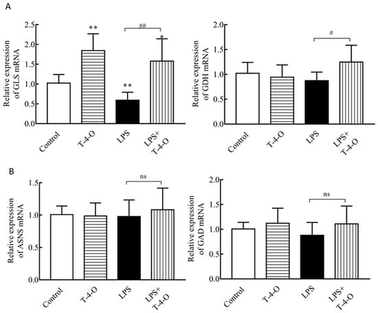 T-4-O enhances glutamine metabolism. (A) Changes in mRNA expression levels of GLS and GDH. (B) Changes in mRNA expression levels of ASNS and GAD. ns, no significant difference; *, p < 0.05, **, p < 0.001 significantly different from the control group; #, p < 0.05, ##, p< 0.001 significantly different from the LPS group.