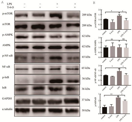 Glutamine metabolism has many functions in cells, such as energy metabolism and autophagy. Some studies found that glutamine metabolism was regulated by mTOR, which could sense the microenvironment energy demand and regulate cell metabolic pathways, thereby modifying NF-κB activity and regulating inflammation []. AMPK is a cellular energy sensor that helps coordinate glucose and lipid metabolism. Therefore, the effects of T-4-O on LPS-induced mTOR, AMPK, and NF-κB signaling pathway-related proteins were examined. As shown in Figure 7A,B, the mTOR protein phosphorylation (p-mTOR) level in the model group was significantly increased compared with the blank control group, and the IκB and NF-κB protein phosphorylation levels (p-IκB and p-NF-κB) were significantly increased as well (p < 0.05), whereas there was no significant difference in the AMPK protein phosphorylation (p-AMPK) level. This result showed that LPS could activate the mTOR and NF-κB signaling pathways. Compared with the model group, p-mTOR, p-IκB, and p-NF-κB were significantly decreased in the LPS + T-4-O group (p < 0.05), indicating that T-4-O may inhibit the mTOR and NF-κB activity to improve LPS-induced inflammatory responses.