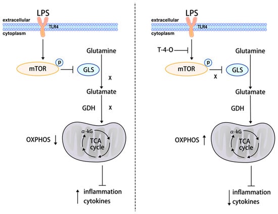 mTOR regulates inflammation, reactive oxygen species, DNA damage, and protein homeostasis and inhibits autophagy. mTOR also guides the conversion from aerobic metabolism (oxidative phosphorylation) to anaerobic metabolism (glycolysis) and promotes the expression of many inflammatory factors (such as IL-6 and TNF-α) through NF-κB []. NF-κB is a protein complex that controls DNA transcription and is nearly ubiquitous in all animal cells. NF-κB participates in cell stress and cytokine and immune responses and is an important regulator of immune responses to inflammation and infection [,,]. IκB binds to NF-κB dimers in the cytoplasm, masking the nuclear localization signal of NF-κB to prevent it from entering the nucleus and binding to DNA. This causes NF-κB to exist in an inactive state in the cytoplasm. Our study found that LPS promoted mTOR activation and IκB phosphorylation and degradation, which increased NF-κB phosphorylation but with no significant effect on the AMPK level. After T-4-O treatment, the mTOR and NF-κB phosphorylation levels significantly decreased. This showed that T-4-O regulated mTOR phosphorylation to inhibit the activation of NF-κB, thus ameliorating inflammatory responses. mTOR inhibition was found to improve the expression level of intracellular GLS, thereby increasing glutamine metabolism [,,]. mTOR was also found to positively regulate GLS transcription [,], indicating that there are many pathways by which mTOR regulates GLS. Our results showed that GLS expression and glutamine metabolism increased after mTOR was inhibited by T-4-O. Therefore, we propose that the mechanism by which T-4-O improves LPS-induced macrophage inflammation is as follows: T-4-O inhibits mTOR phosphorylation to increase GLS expression, thereby promoting glutamine metabolism. The α-KG synthesis is increased and enters the TCA cycle to increase oxidative phosphorylation levels and inhibit activation of the NF-κB signaling pathway. This mechanism improves the LPS-induced macrophage inflammatory responses (Figure 8).