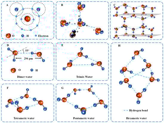Typical cluster structures of water molecules. (A) Electron distribution of water molecules. (B) Polarity of water molecules. (C) Crystalline structure of water molecules. (D) Structure of dimeric water molecular clusters. (E) Structure of trimeric water molecular clusters. (F) Structure of tetrameric water molecular clusters. (G) Structure of pentameric water molecular clusters. (H) Structure of hexameric water molecular clusters.