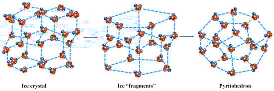Ice is a crystal structure formed by the orderly arrangement of water molecules and the arrangement of water molecules in the crystal of ice is such that each oxygen atom has four hydrogen atoms as its close neighbors, which two hydrogen atoms and oxygen atoms are linked by electron pair bonds and two hydrogen atoms and oxygen are linked by hydrogen bonds to form a crystal structure in which each water molecule is tetrahedral (Figure 1C). Such an arrangement leads to the formation of an open structure; that is, there are considerable holes in the ice. Therefore, the density on ice is relatively small. The process of melting ice into water is the process of breaking partial hydrogen bonds (about 15%), forming ice “fragments”, and partially cyclizing into polyhedrons represented by pyritohedron (Figure 2).