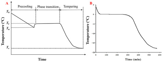 Typical freezing curve of water (A) and common carp (B). Reprinted with permission from Ref. []. Copyright 1 July 2019, copyright Qinxiu Sun, Xinxin Zhao, Chao Zhang, Xiufang Xia, Fangda Sun, Baohua Kong. Abbreviations: T0, initial temperature; Tf, freezing temperature; Tn, nucleation temperature; Te, freezing endpoint temperature.