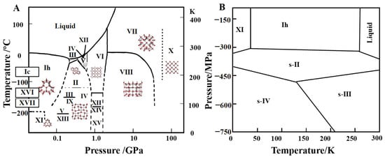 Using the density of hexagonal ice Ih or ice XI (about 0.93 g/cm3) as a reference, most of the ice phases have densities greater than this value, and only cage ice XVI (type II cage hydrate), cage ice XVII, cage ice I, and cage ice H from the hydrated phase have densities lower than this value. In conclusion, the number of known low-density ice phases is relatively small compared to the number of high-density phases. In the phase diagram of water ice, it can be seen that when the temperature is constant, the phase transition occurs continuously with increasing pressure, accompanied by an increase in the density of the ice phase. Conversely, if a series of ice phases with decreasing density is found, it should be possible to expand the phase diagram under negative pressure. Kosyakov and Shestakov [] provided the temperature (T)–pressure (P) phase diagrams of liquid water (Figure 4B), hexagonal ice, and two hypothetical low-density I and II cage ice phases under negative pressure by estimating their Gibbs free energies. The triple points of liquid water, hexagonal ice, and type II cage ice were given in the phase diagrams, but type I cage ice did not appear in the phase diagrams because of its high free energy. Compared with hexagonal ice, cage ice II can exist stably in a lower-negative-pressure area, which shows that an ice phase with lower density can exist in lower-negative-pressure conditions. However, there are still great challenges in the experimental synthesis of the new negative-pressure ice phase structure predicted by theory, which needs to be further studied from both theoretical and experimental aspects.