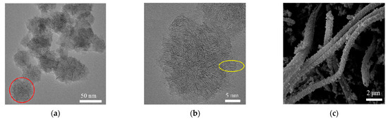 The morphology and structure of the materials synthesized in this work were characterized by field emission scanning electron microscope (SEM, FEI-FEG25, FEI, Hillsboro, OR, USA) and transmission electron microscope (TEM, FEI-F20, FEI, Hillsboro, OR, USA), X-ray powder diffractometer (XRD, SmartLab 9kW, SHIMADZU, Kyoto, Japan), and X-ray photoelectron spectrometer (XPS, ESCALAB Xi+, Thermo, Waltham, MA, USA). The molecular structures of T-PEDOT, SWCNHs, and SWCNHs/T-PEDOT were analyzed using an inVia Reflex spectrometer from Renishaw, UK. Electrochemical experiments were conducted on the CHI440C and Princeton 2273 electrochemical workstation with a three-electrode system.
