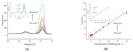 Under the optimized experimental conditions, the analytical capabilities of the developed electrochemical sensing strategy for TBHQ were evaluated using the DPV method. Figure 6a displays the oxidation peaks of MB and TBHQ at −0.076 V and 0.228 V, respectively. It is observed that the oxidation peak currents of TBHQ increased with increasing concentrations of TBHQ, whereas the oxidation peak current of MB remained largely unchanged. Figure 6b shows that the ratio of TBHQ and MB oxidation peak currents (ITBHQ/IMB) is directly proportional to the concentration of TBHQ (CTBHQ). The relationship is quantified by the following regression equations: