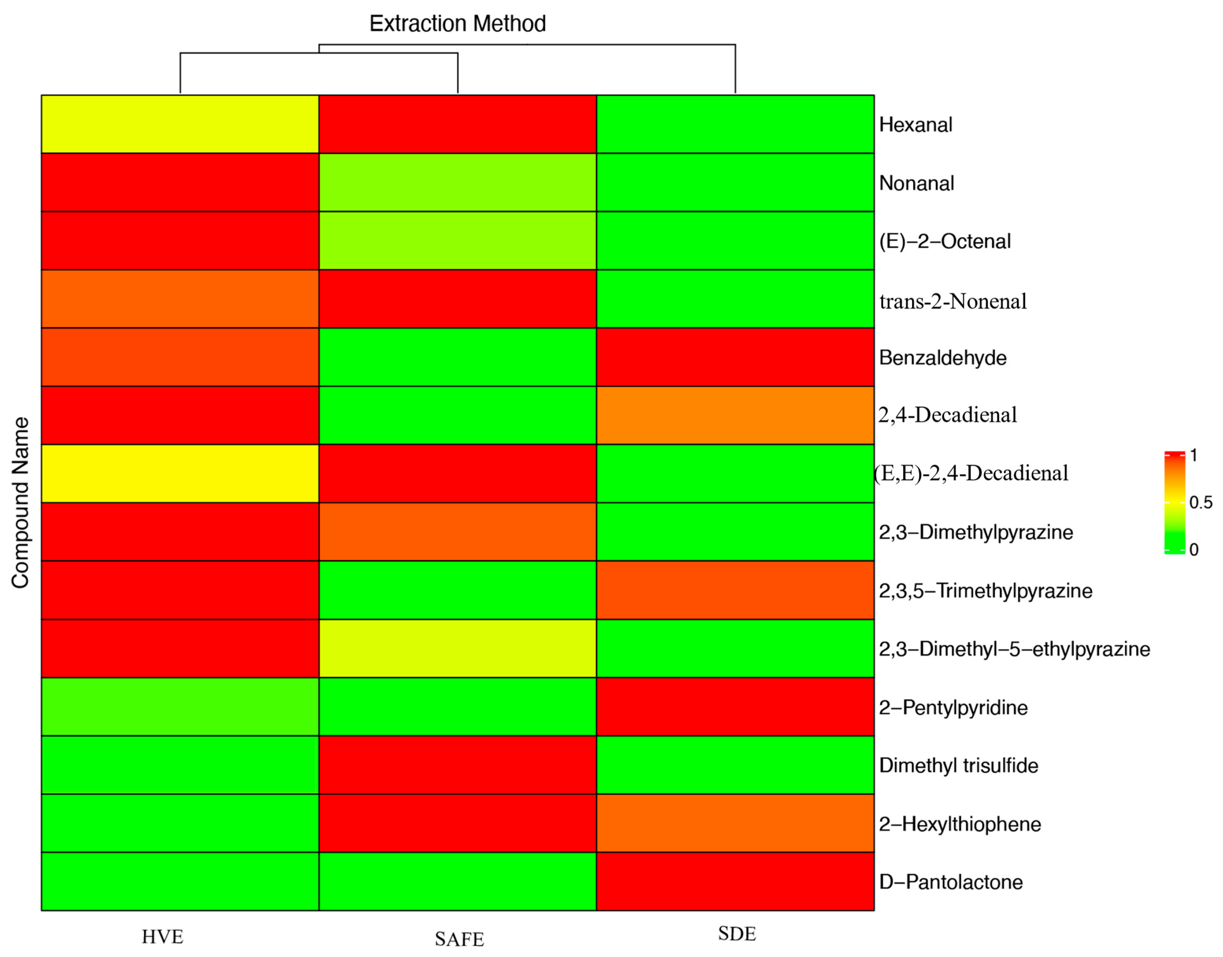 2.5.1. Preliminary Extraction of Key Volatile Flavor Compounds from Fried Tilapia Mince Using Accelerated Solvent Extraction Device (ASE)