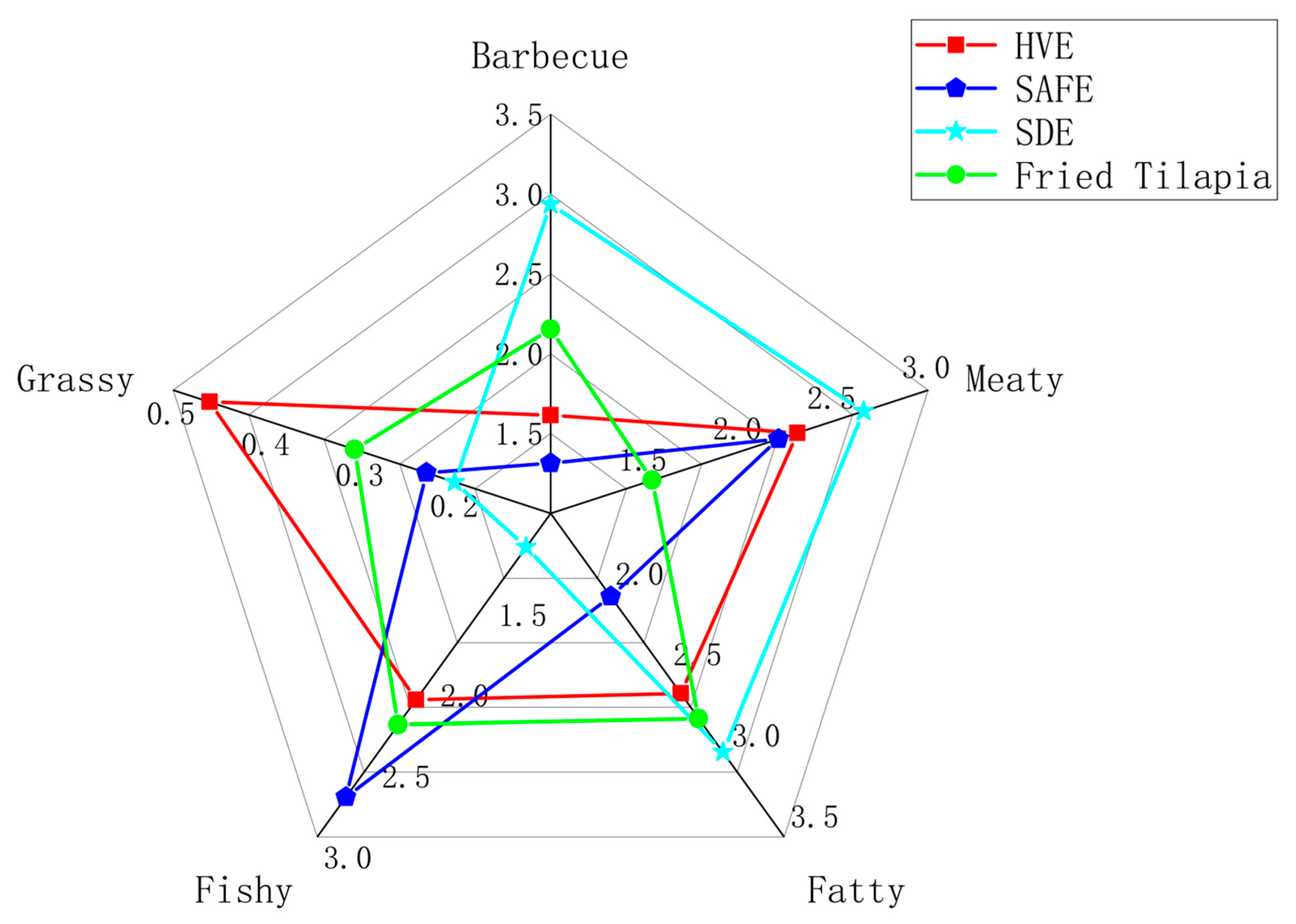 3.3. Comparison of Odor Profiles of Volatile Compounds in Fried Tilapia Mince by Three Different Extraction Methods