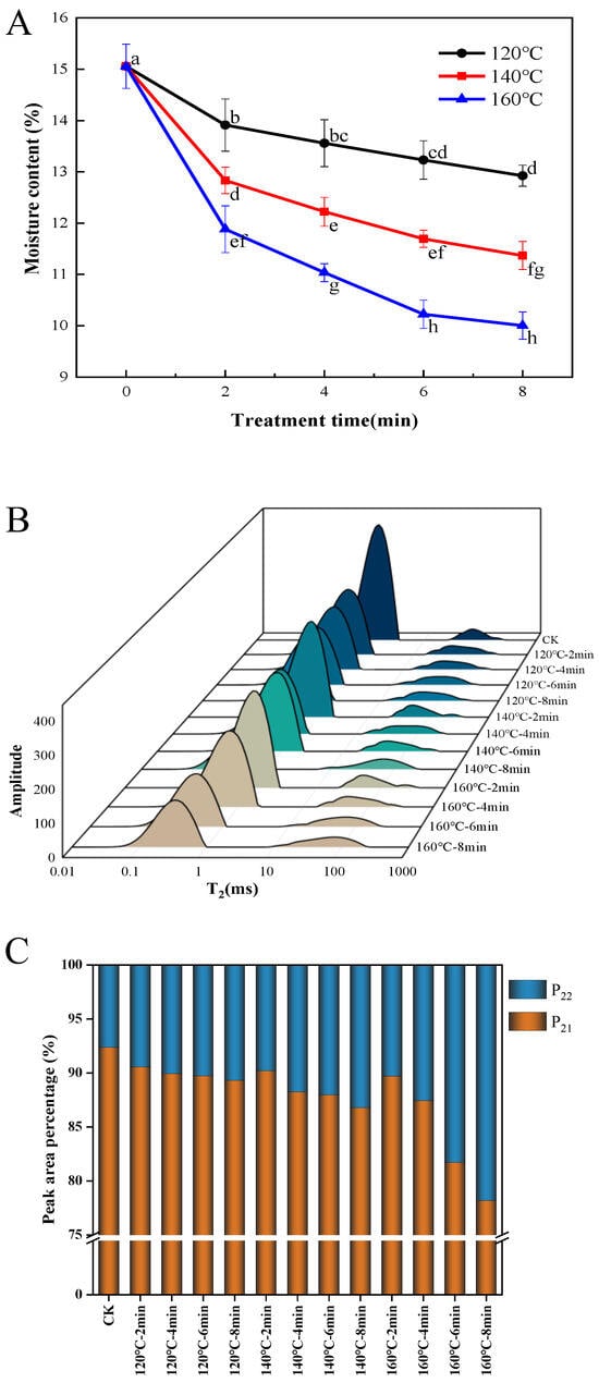 Effect of SS treatment on moisture content (A), T2 relaxation time distribution (B), and T2 peak ratio (C) of LMR. Different letters in the (A) indicate a significant difference (p < 0.05).