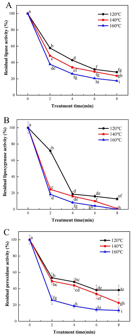 Effect of SS treatment on residual activities of lipase (A), lipoxygenase (B), and peroxidase (C) in LMR. Different letters in the figure indicate a significant difference (p < 0.05).
