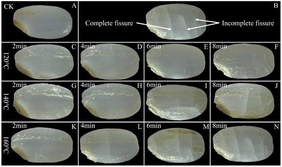 The commercial value of rice is compromised when alterations in grain appearance are identified as indicative of grain damage. Figure 3 provides a visual comparison of the control group and SS-treated LMR under different processing conditions. The surface of untreated LMR exhibits an intact and smooth texture, with no discernible fissures evident after treatment at 120 °C (Figure 3C–F). Upon elevating the temperature to 140 °C, fissures become visible on the surface after 6 min of SS exposure (Figure 3I). Notably, the application of higher temperatures (160 °C) and/or longer durations (6 and 8 min) of SS treatment led to the development of deeper fissures (Figure 3J,M,N). Previous studies have substantiated the physically destructive effects of various thermal treatment techniques on the appearance of cereal grains [,,]. These morphological changes can be attributed to the moisture gradient between the interior and exterior of the LMR grains []. Specifically, when LMR is exposed to elevated temperatures, it experiences a phenomenon referred to as “flash-off” of internal liquid water, leading to a rapid evaporation process and the consequent build-up of pressure within the grains, ultimately resulting in their expansion []. The resultant high surface tension and compressive stress appear to breach the integrity of the kernel layer, consequently giving rise to the formation of water- and heat-permeable fissures. These fissures, in turn, facilitate mass and heat transfer during SS treatment [,].