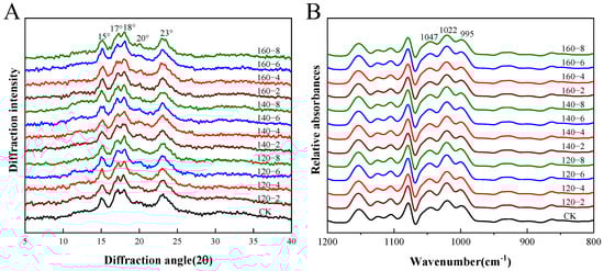 The utility of X-ray diffraction becomes evident in its ability to identify the densely packed helical structures, denoting crystalline formations within starch granules. Characterized by regular three-dimensional geometrical patterns, these structures enable the assessment of both the relative crystallinity and the long-range structure of starch []. Figure 4A and Table 2 present the X-ray diffractograms and relative crystallinity data, respectively, for starch samples derived from SS-processed LMR. The untreated samples exhibited the conventional A-type crystalline pattern observed in starches, featuring two broad single peaks at 15° and 23° (2θ) and dual peaks at 17° and 18° (2θ) []. Remarkably, SS treatment induced no significant alterations in the diffraction pattern, suggesting that the crystal form of LMR starch remained unchanged. In contrast to untreated LMR starch, the distinct peak proximate to 20° in SS-treated LMR starch progressively increased in prominence with elevated SS temperature and prolonged treatment duration (Figure 4A). This distinctive pattern represents a classic V-type diffraction, indicative of potential interactions between starch molecules and polar organic substances during the heat treatment process. This suggests the formation of complexes such as amylose–lipid complexes [].