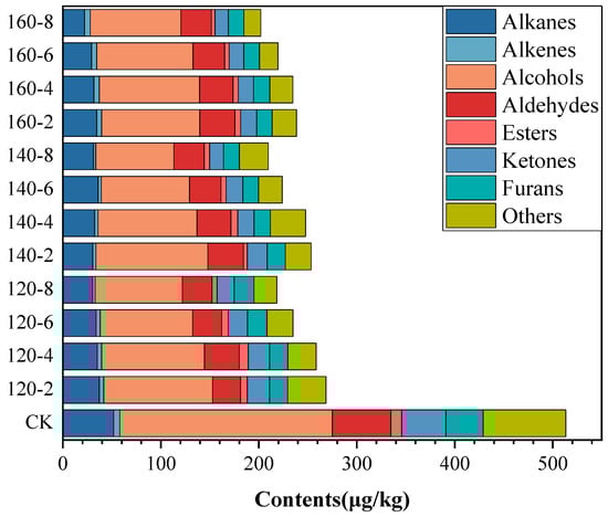 The volatile organic compounds extracted from both untreated and SS-treated LMR grains were subjected to analysis using HS-SPME-GC-MS. A total of 59 volatile compounds were identified based on mass spectra data from the NIST 17 library and the Kovats retention index (RI). These compounds encompassed 4 alkanes, 2 alkenes, 10 aldehydes, 14 alcohols, 12 ketones, 5 esters, 5 furans, and 7 compounds categorized under others (Tables S1–S3). Following SS treatment, there was a discernible reduction in the content of each chemical class of compounds in LMR, exhibiting variable degrees of decrease (Figure 5). The reduction in content can be attributed to the ruptured cellular coat, facilitating the rapid release of volatile components under high-temperature conditions []. Furthermore, the reduced enzymatic activity observed in SS-treated LMR could potentially decelerate biochemical reactions and/or oxidative degradation processes, consequently resulting in decreased concentrations of volatile compounds.