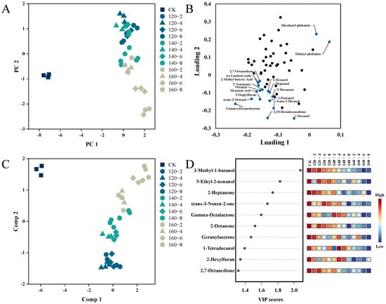 PCA score plot (A), PCA loadings plots (B), PLS-DA score plot (C), and VIP scores (D) of the volatile profiles of the LMR. CK: untreatment LMR, 120−2: LMR treated with SS at 120 °C for 2 min, with comparable conditions applied to other cases.