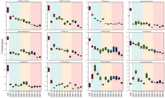 By integrating results from both the PCA loading plot and the PLS-DA VIP score plot, a total of 12 distinctive compounds were identified. This compilation comprises the top 10 VIP scores and an additional 2 compounds strategically positioned in the upper right quadrant of the PCA loading plot. The alterations in their contents are visually represented using box plots (Figure 7). The first 10 compounds showcased a negative correlation with the temporal extent of SS treatment, contrasting with the final two esters which exhibited a positive correlation with SS treatment time. Esters may originate from reactions involving naturally occurring acids and alcohols. The observed heightened levels of Diisobutyl phthalate and Dibutyl phthalate in this study could be attributed to the facilitated synthesis induced by the SS treatment []. The concentrations of 3-Methyl-1-butanol, Tetradecanol, 2-Heptanone, 2-Octanone, and Geranylacetone exhibited a diminishing trend with escalating SS treatment time and temperature. This aligns with the outcomes of a study by Yang et al. [] on superheated-steam-treated black beans, wherein a marked reduction in the levels of 2-heptanone and 2-octanone was observed. The application of SS in barley cooking, as investigated by Takemitsu et al. [], yielded analogous outcomes. Utilizing gas chromatography–mass spectrometry for the evaluation of undesirable odors in grains demonstrated substantial mitigation of such odors in SS-based cooking in contrast to conventional cooking methods.