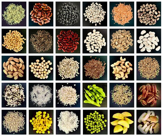 Thirty popular alternative proteins sorted by dry-weight protein content according to Table 1, including hemp seed 31.6%, kidney bean 25.9%, black bean 24.4%, navy bean 24.1%, red lentil 23.9%, pinto bean 23.7%, brown lentil 23.6%, green lentil 23.6%, small red bean 23.5%, large white bean 23.4%, peanut 23.2%, large lima bean 21.5%, almond 21.4%, chick pea 20.5%, sunflower seed 18.9%, flaxseed 18.3%, cashew 17.4%, farro 15.6%, wild rice 14.7%, quinoa 14.1%, oat 13.5%, soy bean 11.9%, buckwheat 11.1%, pecan 10.0%, barley 9.9%, corn 9.4%, white rice 7.0%, green peas 5.4%, potato 2.6%, mushroom 2.4%, from top left to bottom right.