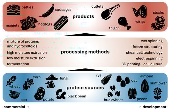 Developing meat analogs involves the selection of protein sources, bottom, processing methods, middle, and product shapes, top. Protein sources can be divided into those that are already commercially available, left, and those that are still in development, right [,,,,,,]. Processing methods can be divided into commercially available, left, and in development, right [,,,,,]. Final products can be divided into comminuted meat analogs, left, and whole-muscle analogs, right [,,].